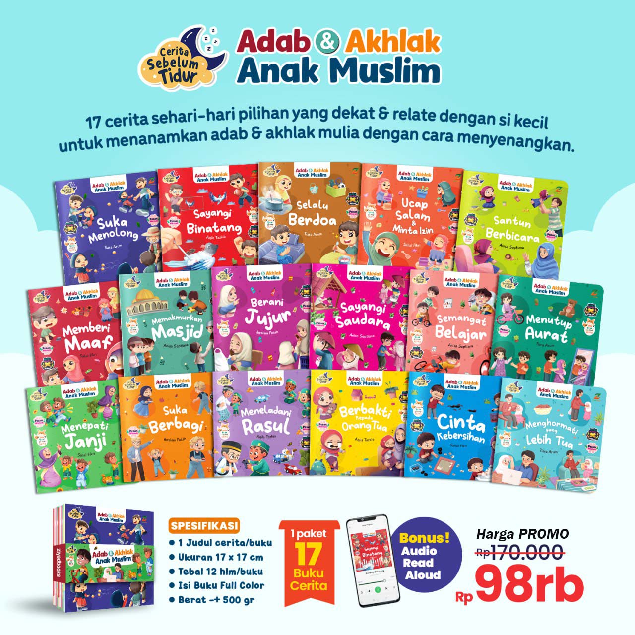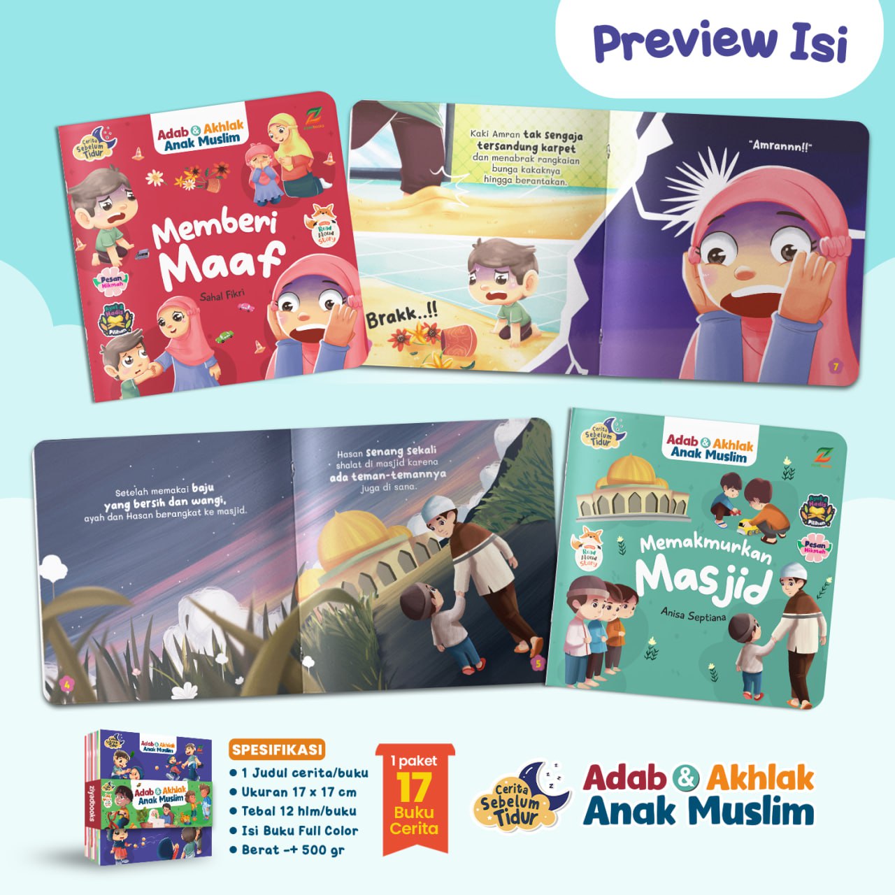 Soft Cover | 17 Buku cerita/set | 1 Judul Cerita/buku | Ukuran 17×17 cm I Tebal 12 hlm/buku | Isi HVS 80gr | Full Color & Full Ilustrasi | Jahit kawat | Packing paper-belt