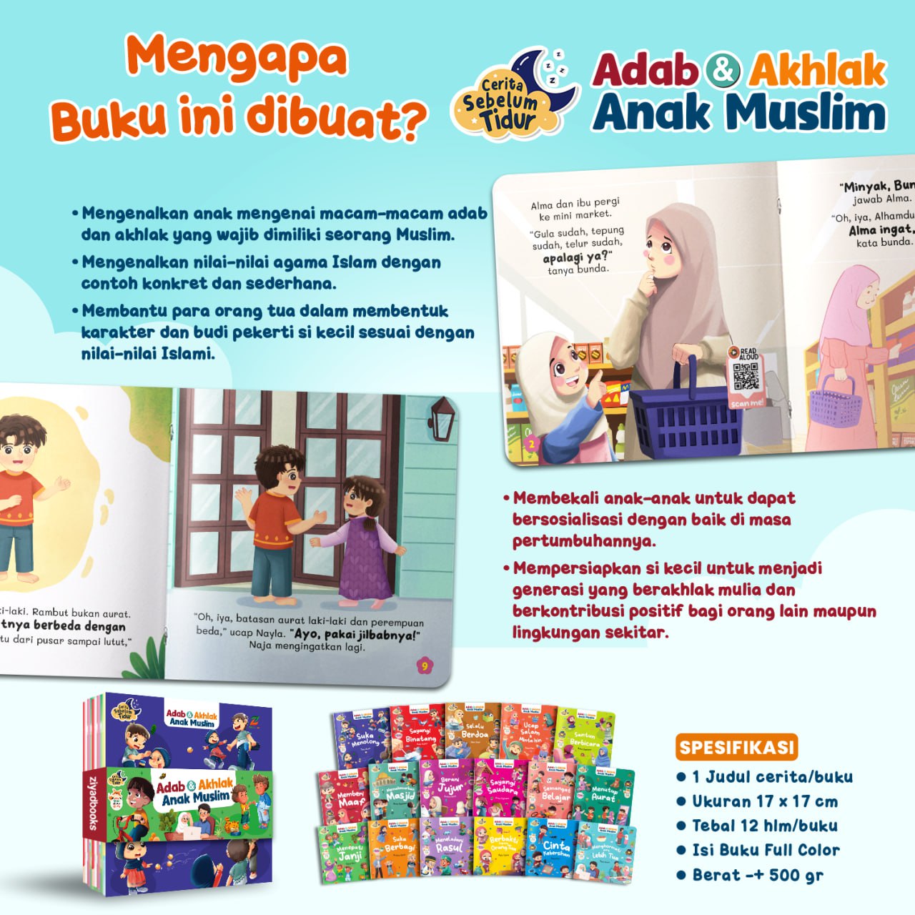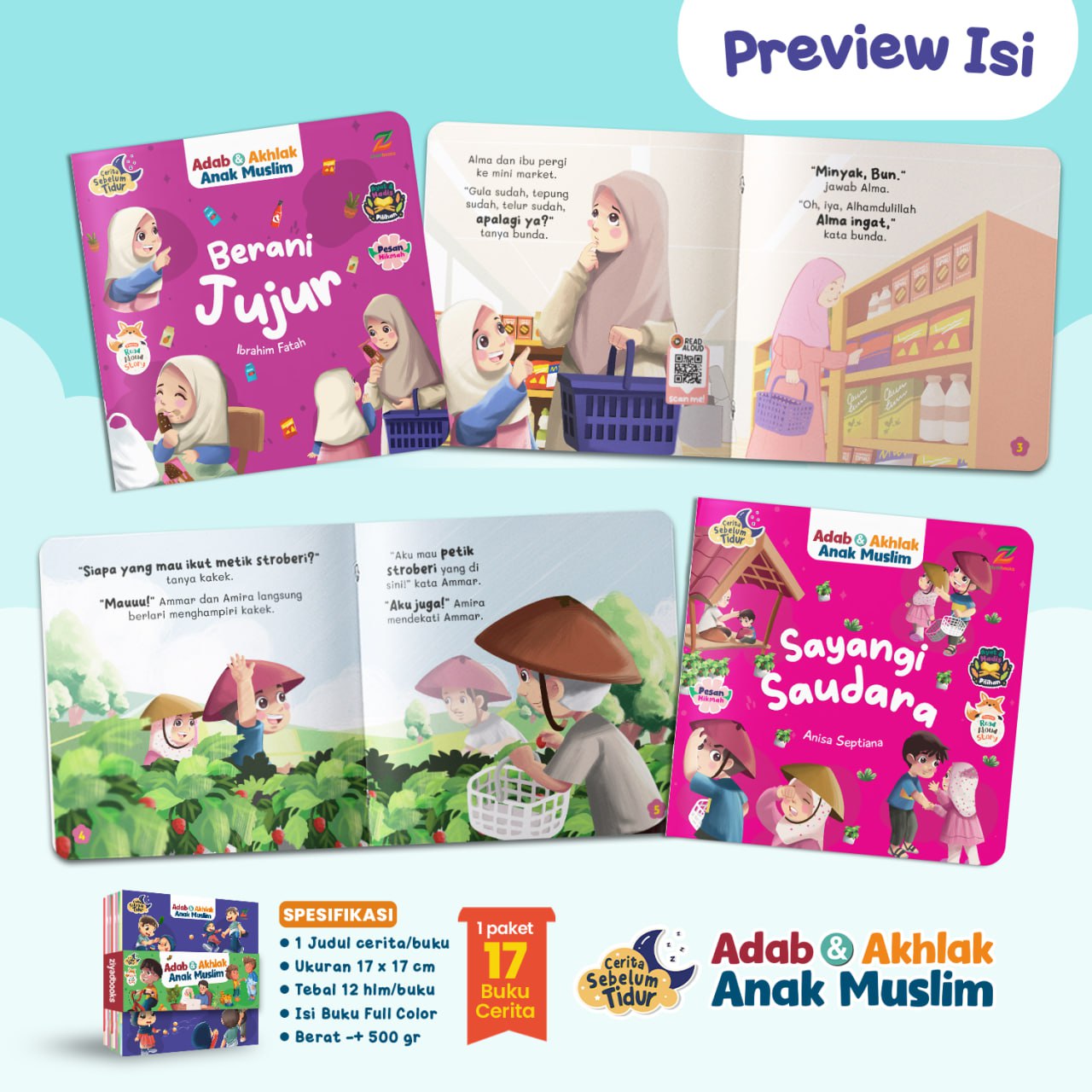 Dilengkapi ilustrasi lucu dan fullcolor dapat menarik minat baca si kecil. Tak hanya itu saja, terdapat 3 fitur utama di setiap buku, yaitu scan barcode read aloud story, pesan hikmah, dan ayat/hadis pilihan yang dapat membantu si kecil menambah wawasannya ๐Ÿค—