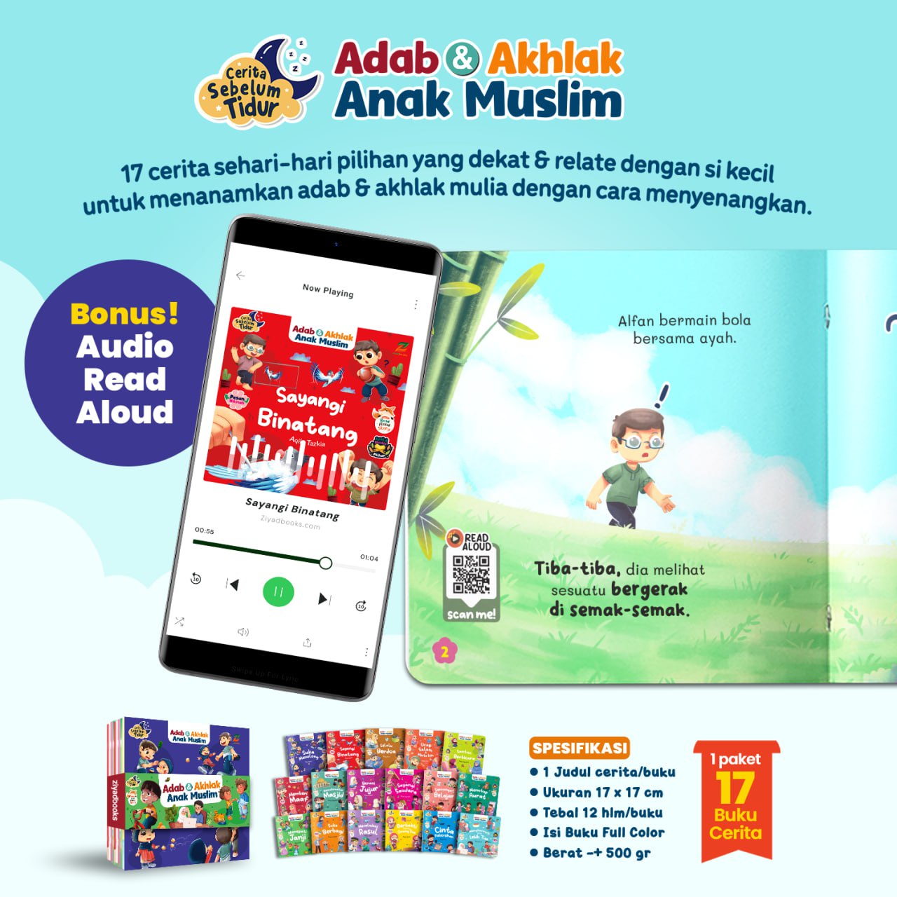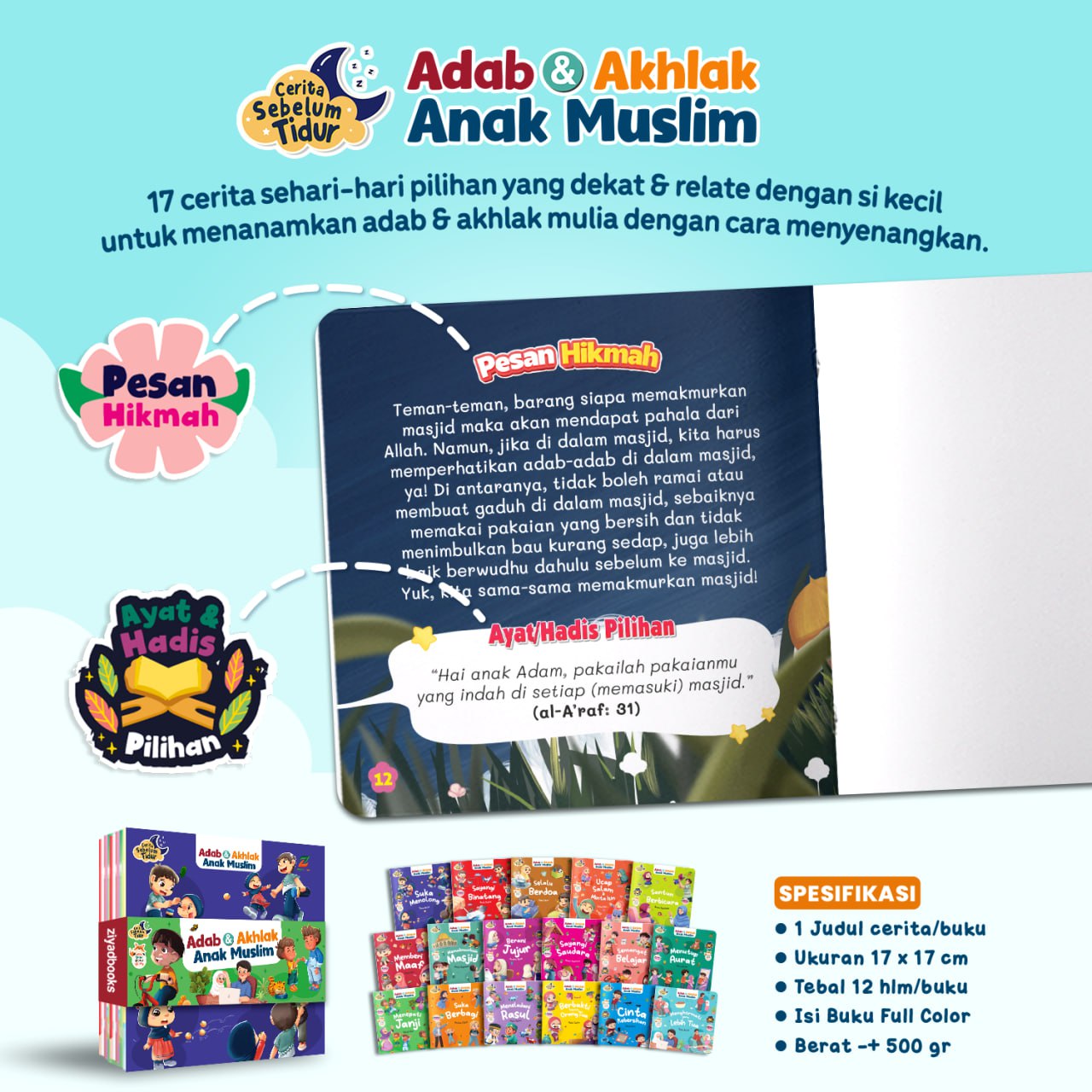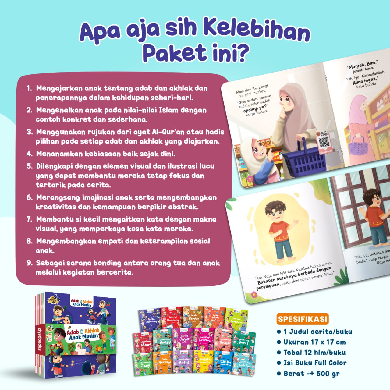 Dalam satu paket berisi 17 buku yang mengenalkan 17 adab dan akhlak sehari-hari. Dikemas dalam bentuk cerita dengan bahasa yang sederhana sehingga selaras dengan keseharian anak.