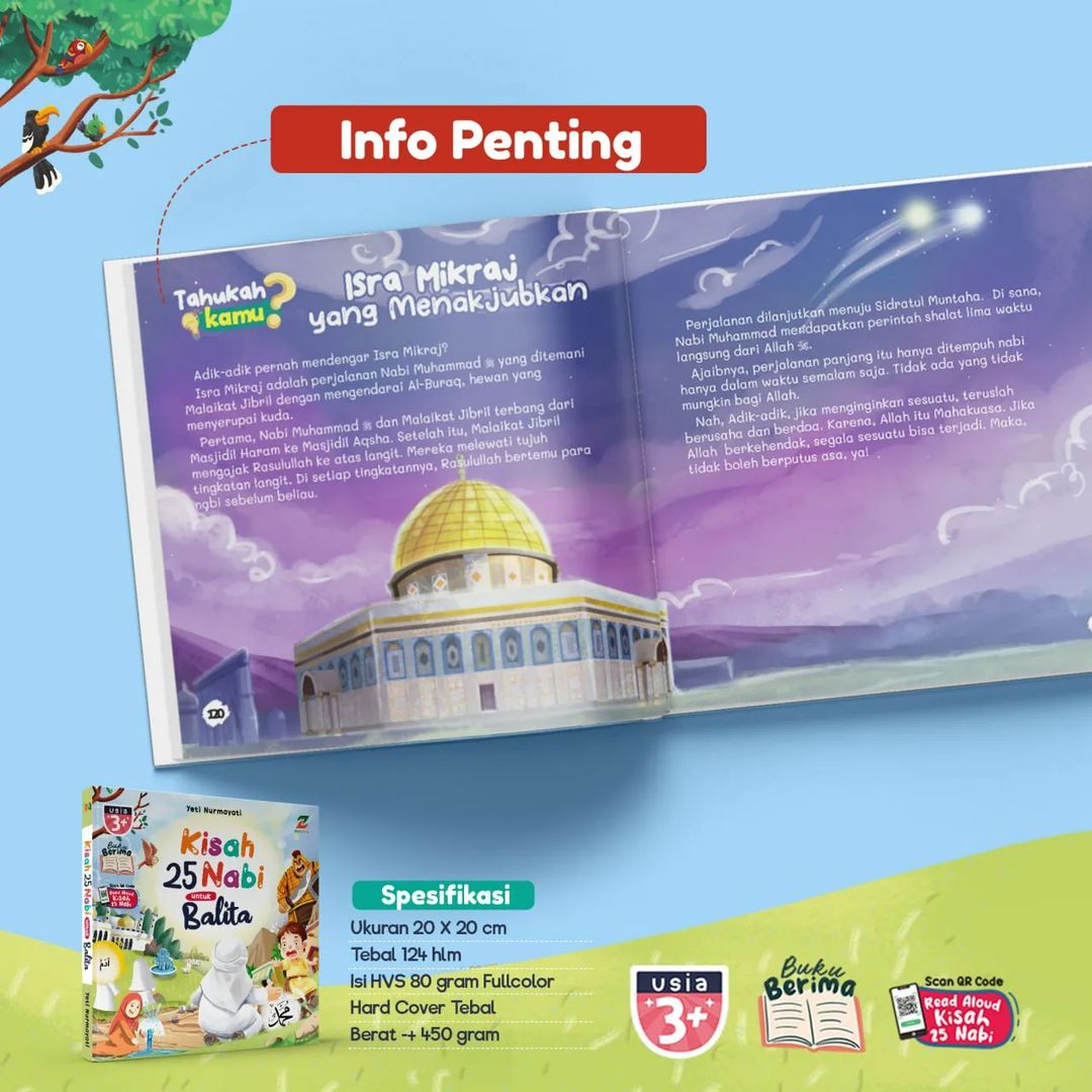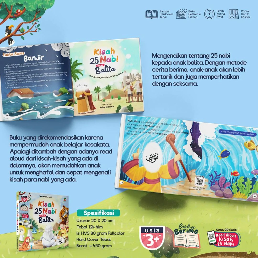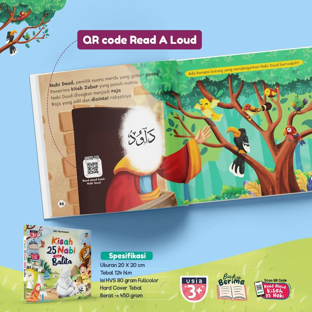 Bonus QR Code: Sebagai tambahan, buku ini menyertakan QR code yang dapat dipindai untuk mendengarkan kisah-kisah Nabi secara read aloud. Ini memberi kesempatan bagi si Kecil untuk menikmati cerita dengan cara yang berbeda, memperkuat pemahaman dan daya ingat mereka.