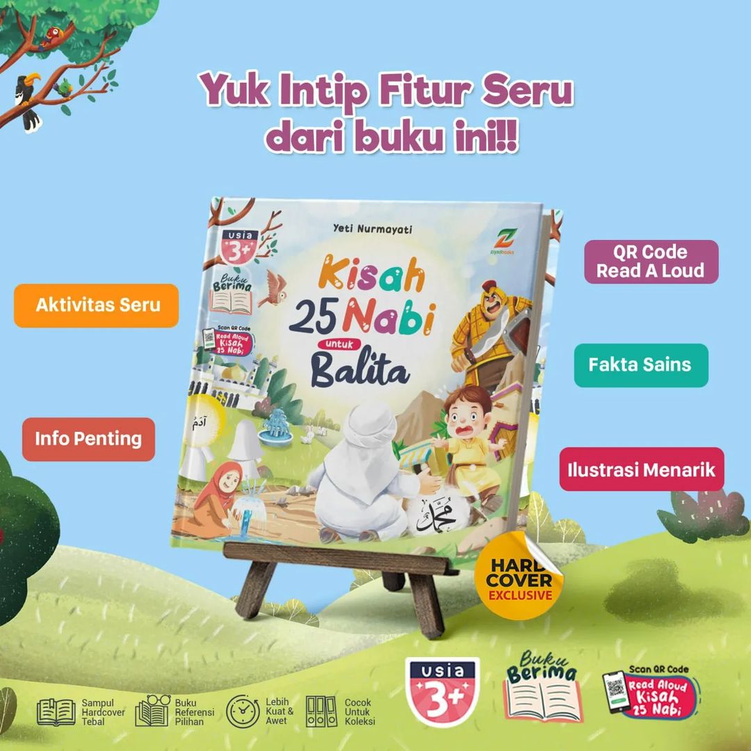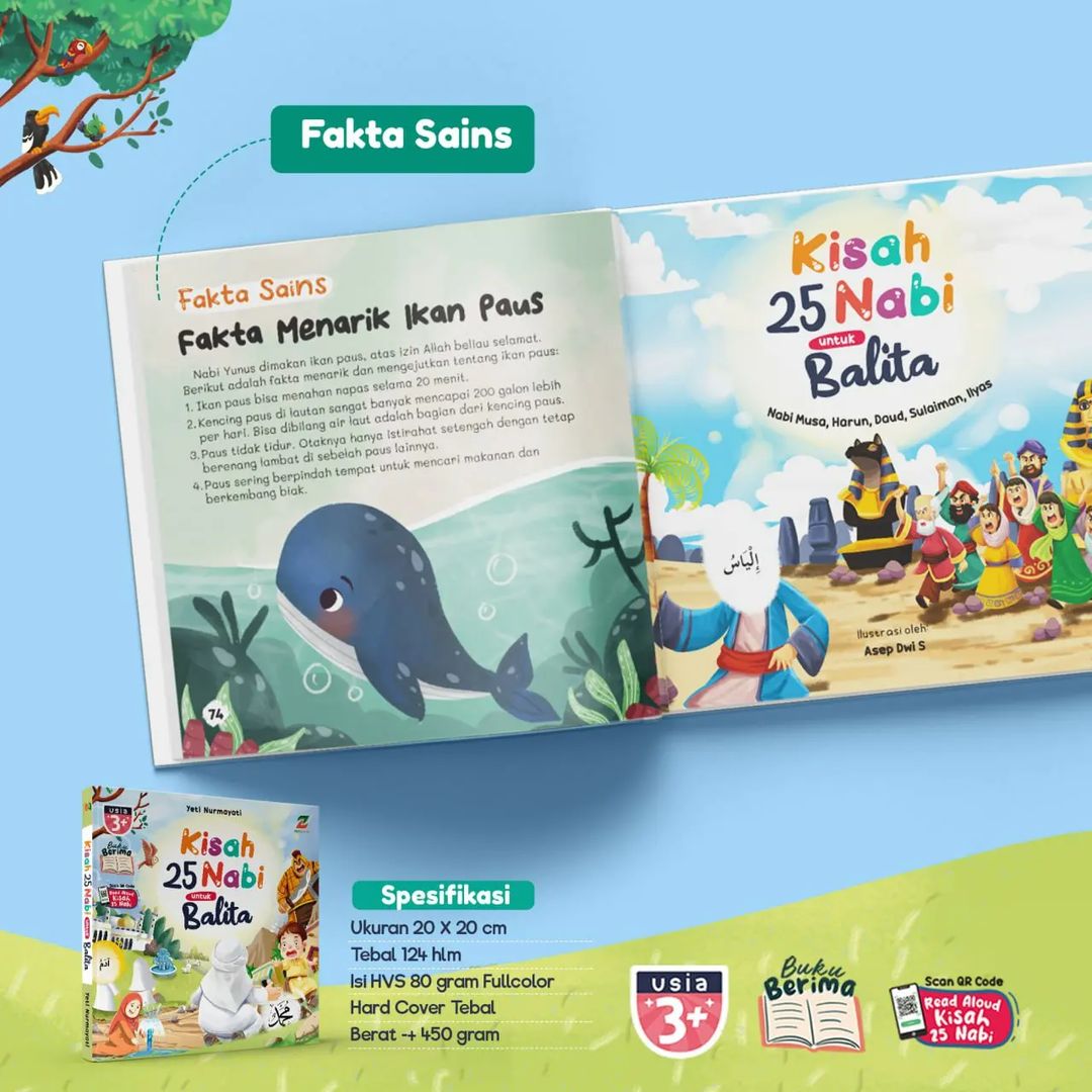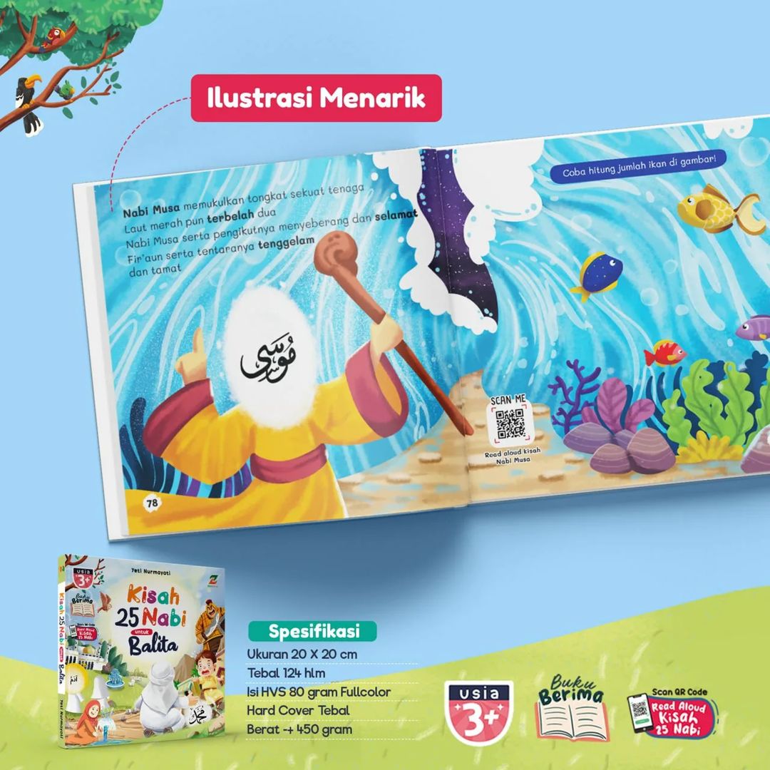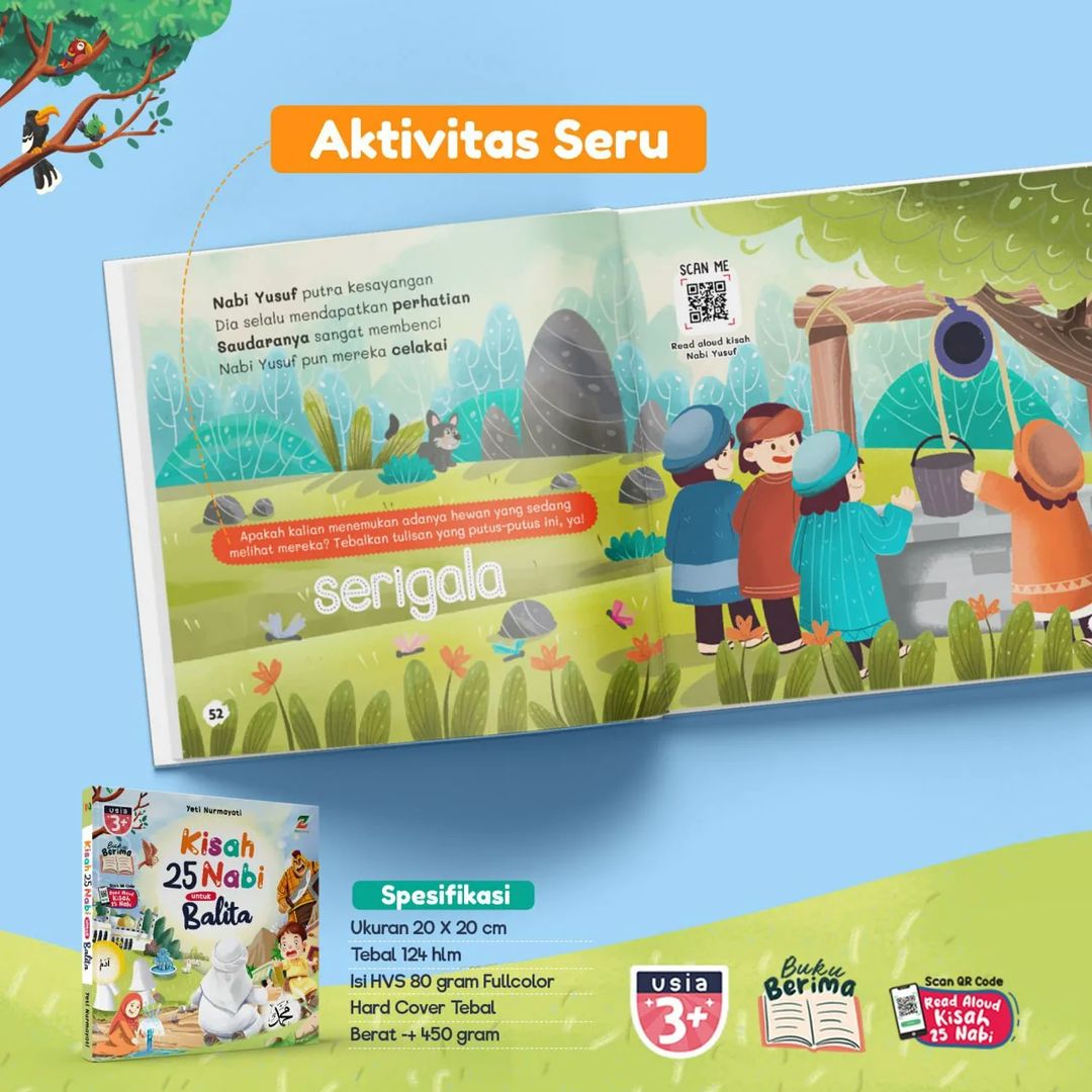 Bonus QR Code: Sebagai tambahan, buku ini menyertakan QR code yang dapat dipindai untuk mendengarkan kisah-kisah Nabi secara read aloud. Ini memberi kesempatan bagi si Kecil untuk menikmati cerita dengan cara yang berbeda, memperkuat pemahaman dan daya ingat mereka.